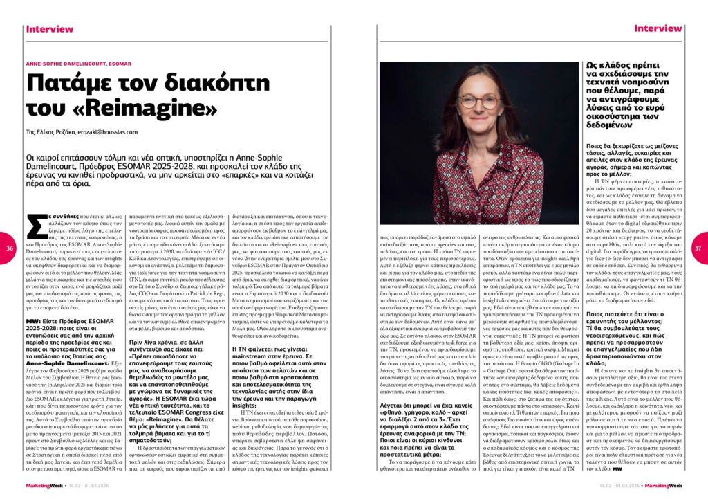 AI brings opportunities, innovation always offers new possibilities, and as an industry we have the power to design our future. I would see two big threats for us: number one is to be passive – this was our behaviour when digital came into force 20 years ago – and the second one would be that we adopt the ‘copy paste’ position, as we did in the past again with the arrival of the digital (ie: a face-to-face questionnaire can’t be pasted for an online version). So, I would encourage the industry, our professionals, academics to imagine what AI we want, to shape it and to promote it. Associations have a key role to play here.